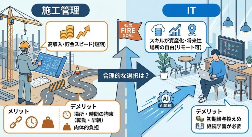 施工管理は「貯金スピード」に優れ、ITは「資産になるスキル」に優れています。 周囲からは「大手ゼネコンの方が安泰だ」と言われましたが、僕は安心感だけで人生を選びたくありませんでした。
