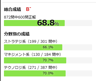 総合評価で600点以上取っていても、上記3分野のどれか一つでも300点未満であれば、その時点で不合格となります。